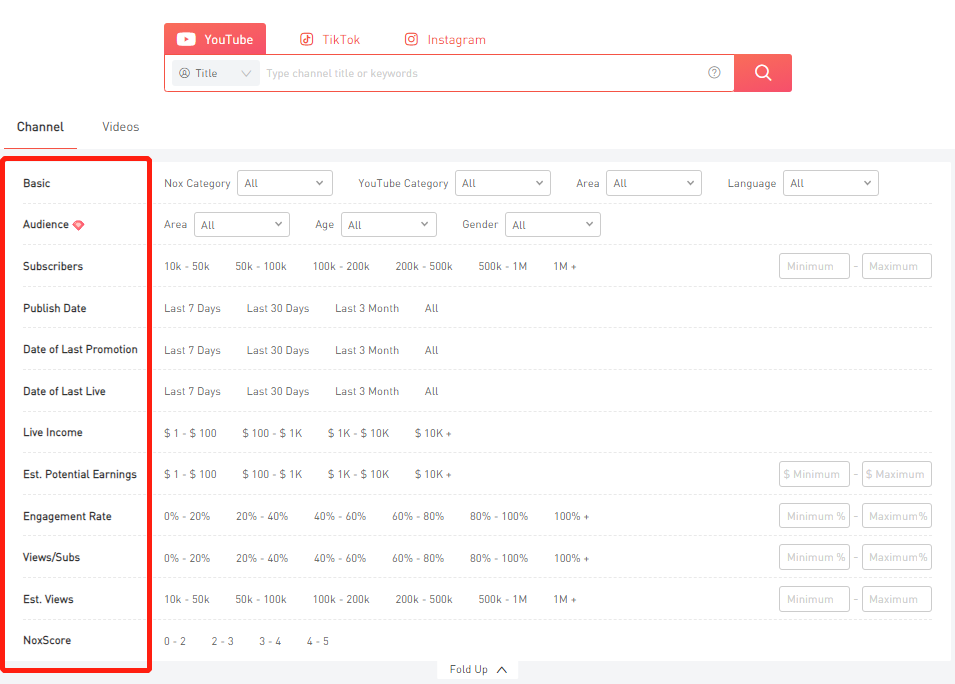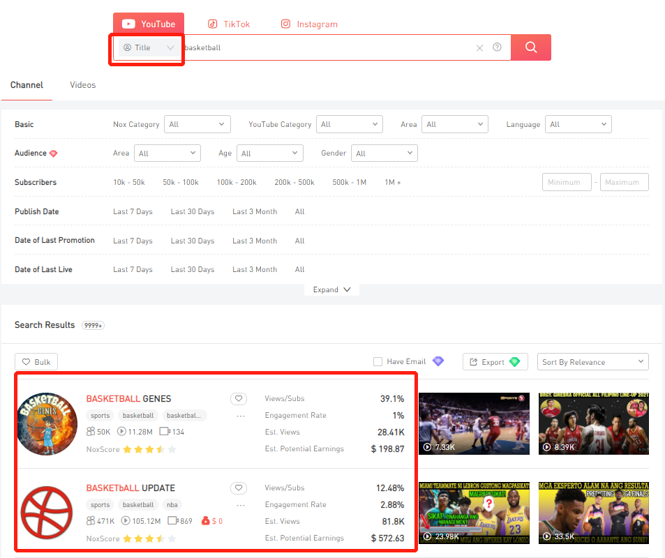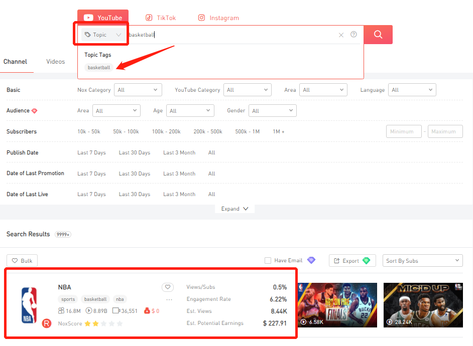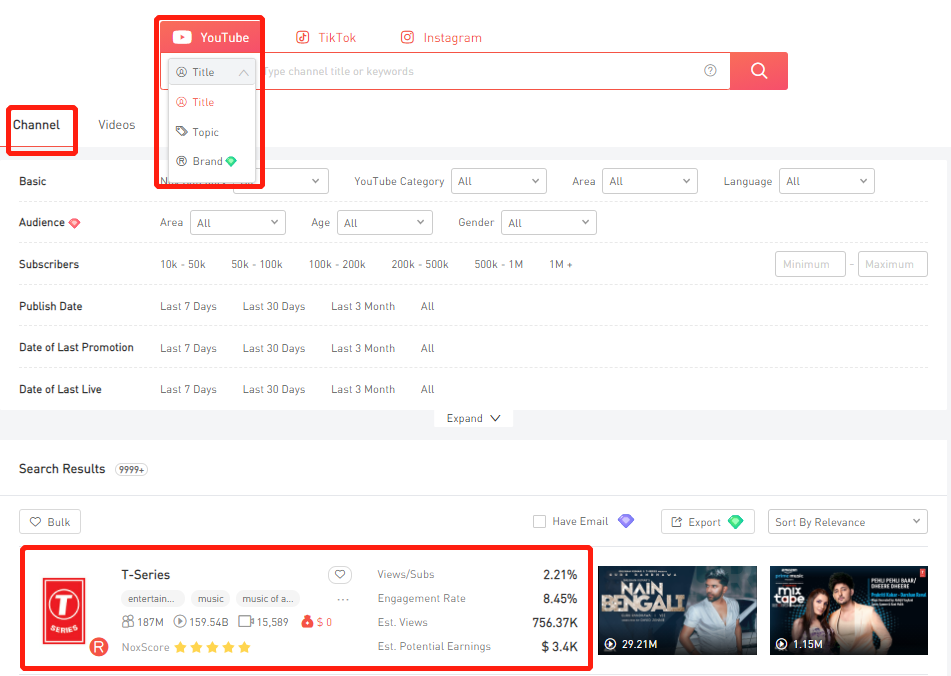 NoxInfluencer allows users to search keywords by channel title, topic.