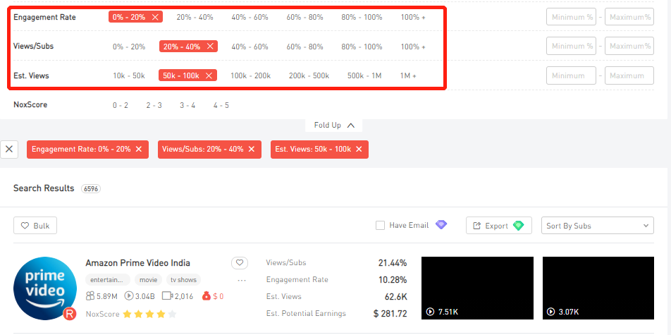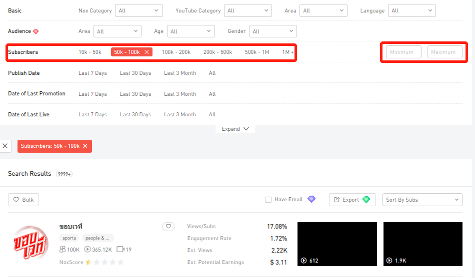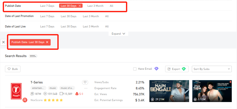 To make sure the channels users find are active to operate, NoxInfluencer can help users filter out those active channels with high views and high engagement rate.