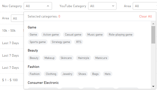 Channels can be divided by Nox Category and YouTube official category. The former are designed by NoxInfluencer tech team, including 12 categories and 52 sub-categories.