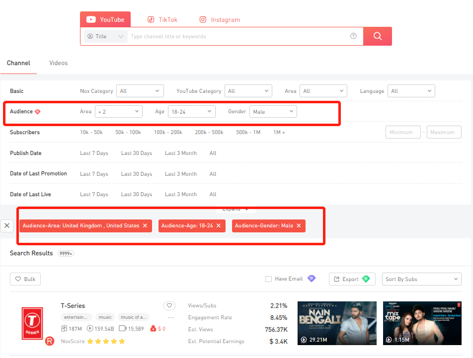 So, NoxInfluencer allows users to search influencer by moderating the audience conditions.