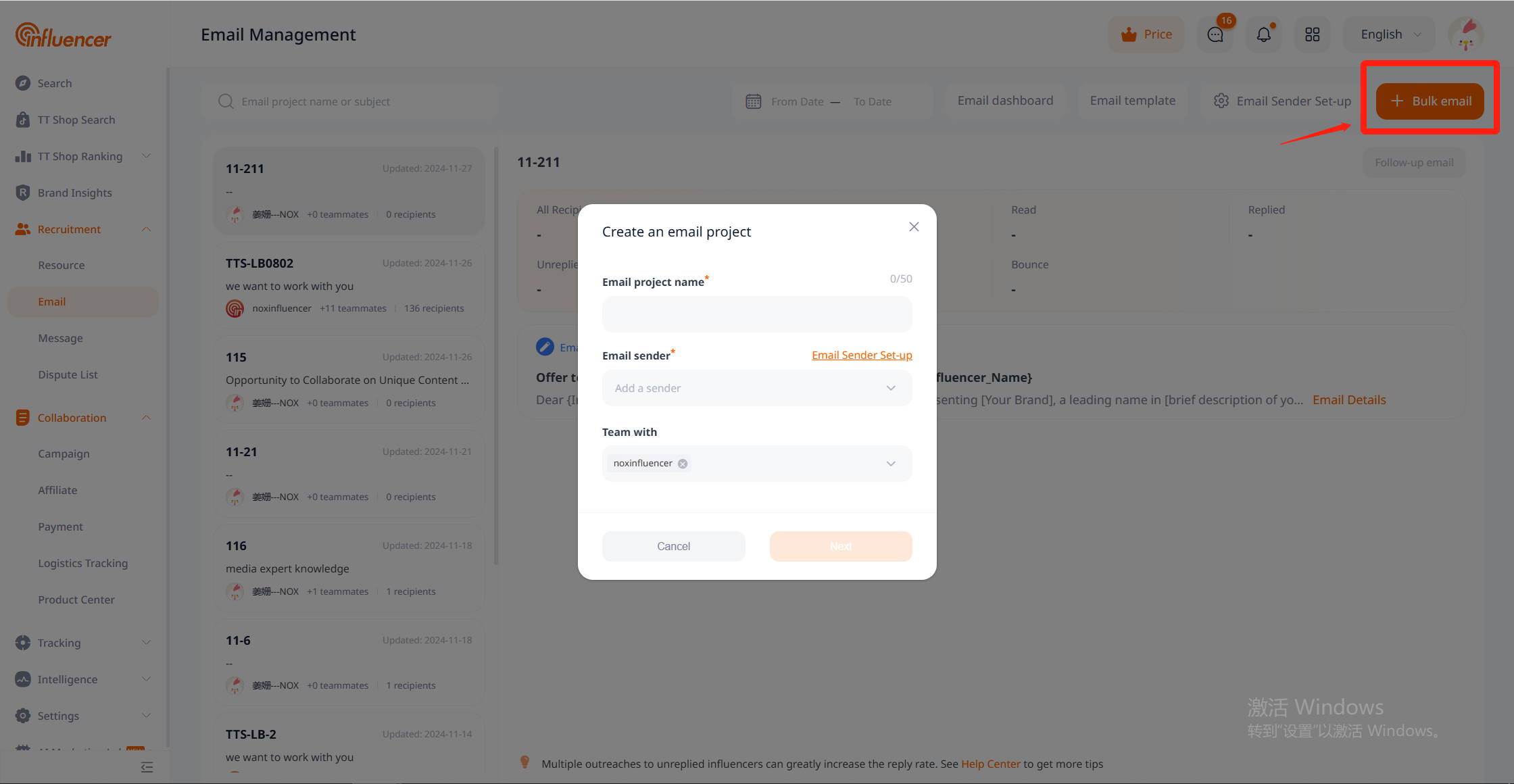 On the Noxinfluencer platform, besides using the “Influencer Invitation” feature in the campaign to send bulk emails to influencers, you can directly create an email project to send bulk emails.