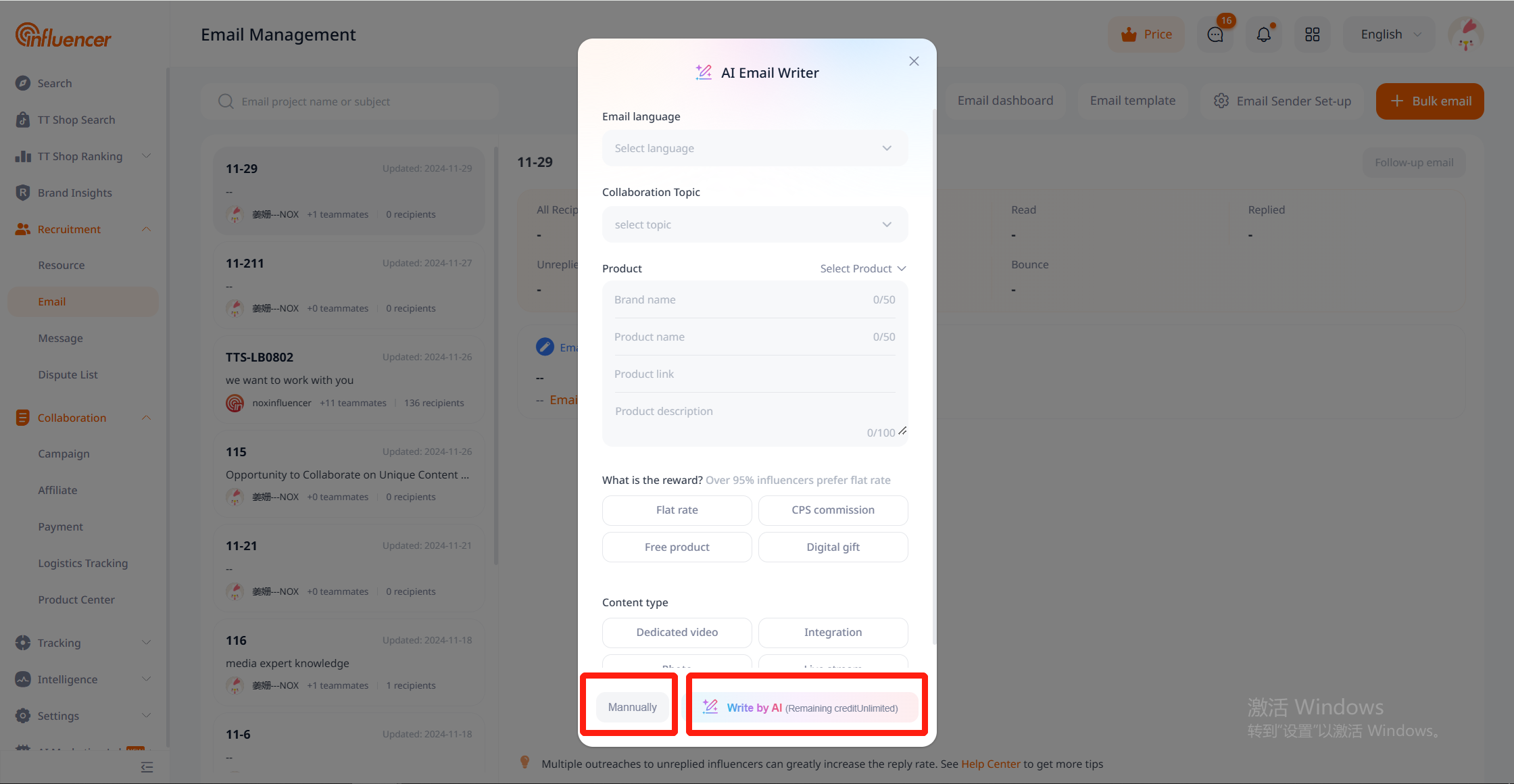 Click on “Bulk Email” to create a new email project, which will trigger a pop-up with AI-generated emails. Users can fill in the required information to automatically generate email content. If not needed, click the “Mannully” button at the bottom of the pop-up to enter the email editing page.