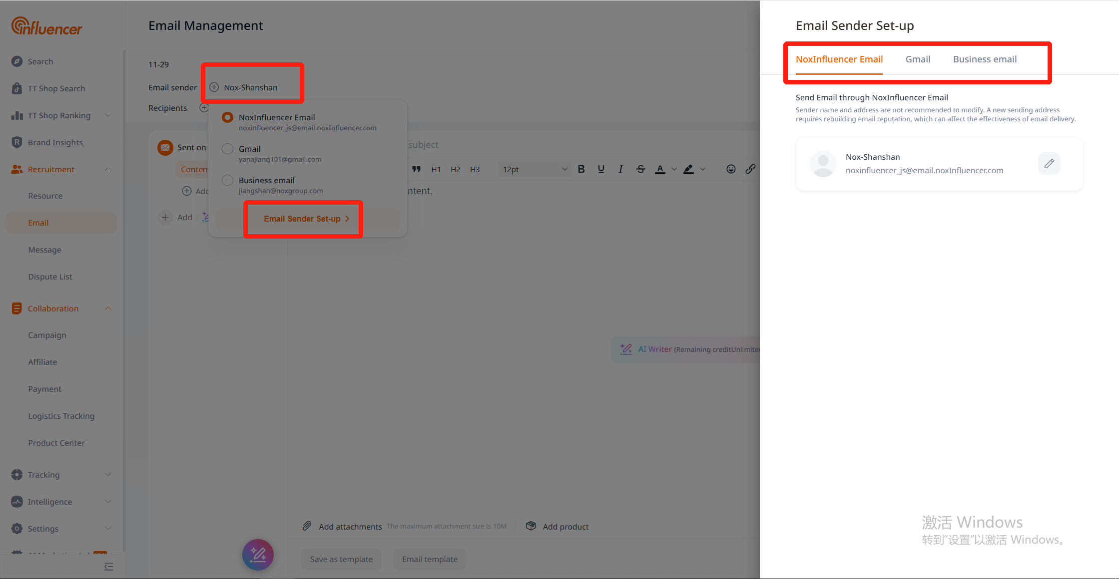 The email sender can be chosen from NoxInfluncer email, Gmail, or Bussiness email, each with its differences, allowing users to select the most suitable one accordingly.