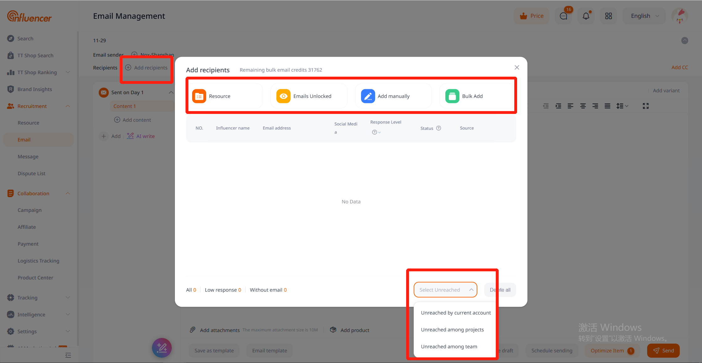 Recipients can be chosen from influencer resources, viewed emails list, or manually add influencers with existing email addresses ( the bulk add feature can be used for large numbers of recipients).