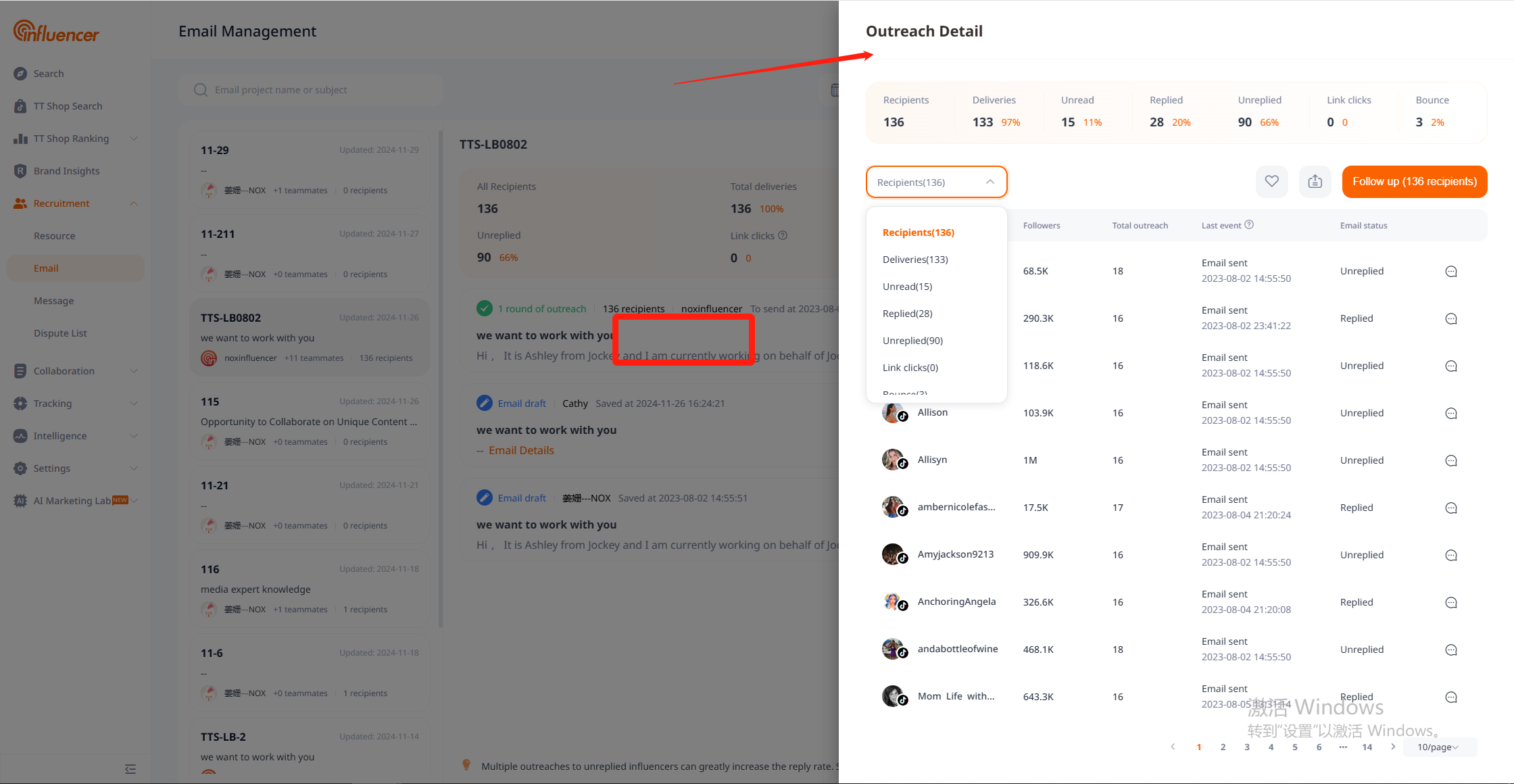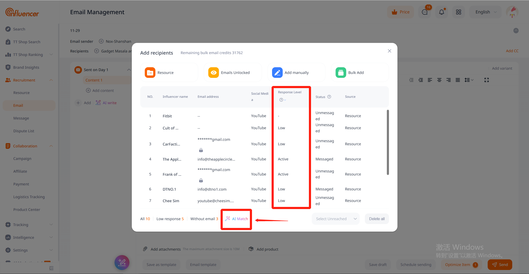 2. Click the AI Match button at the bottom of the recipient list, and the system will recommend similar influencers with higher reply activity based on the user-added recipient list.