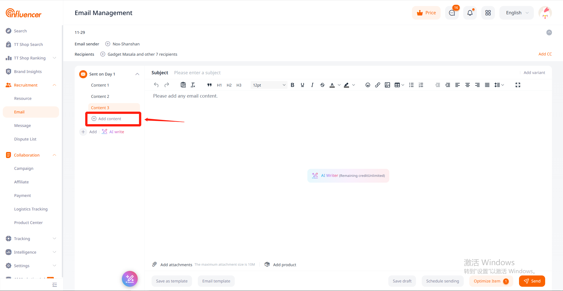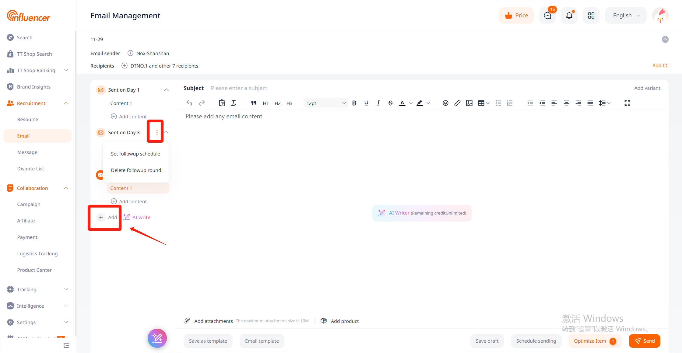 In addition to adding manually, you also can use the AI Write function to let the system generate follow-up email contents.