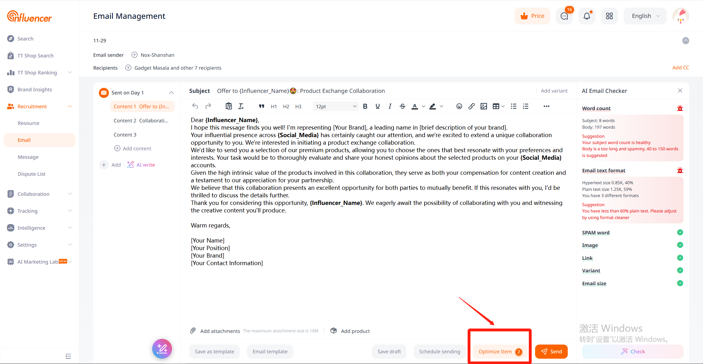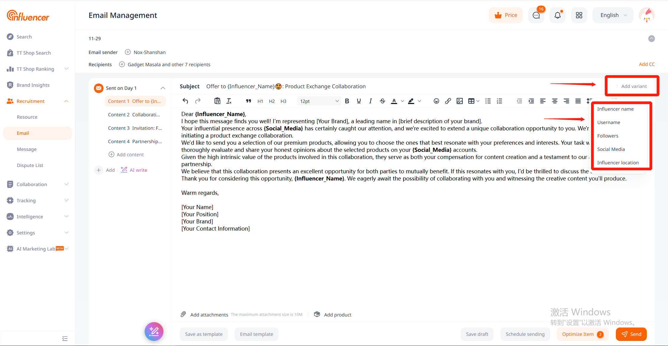 Supports adding the influencer name, username, followers, social media, and influencer location as variables in the email subject or body. Please add at least one variable to differentiate content, which can effectively improve delivery and reply rates.