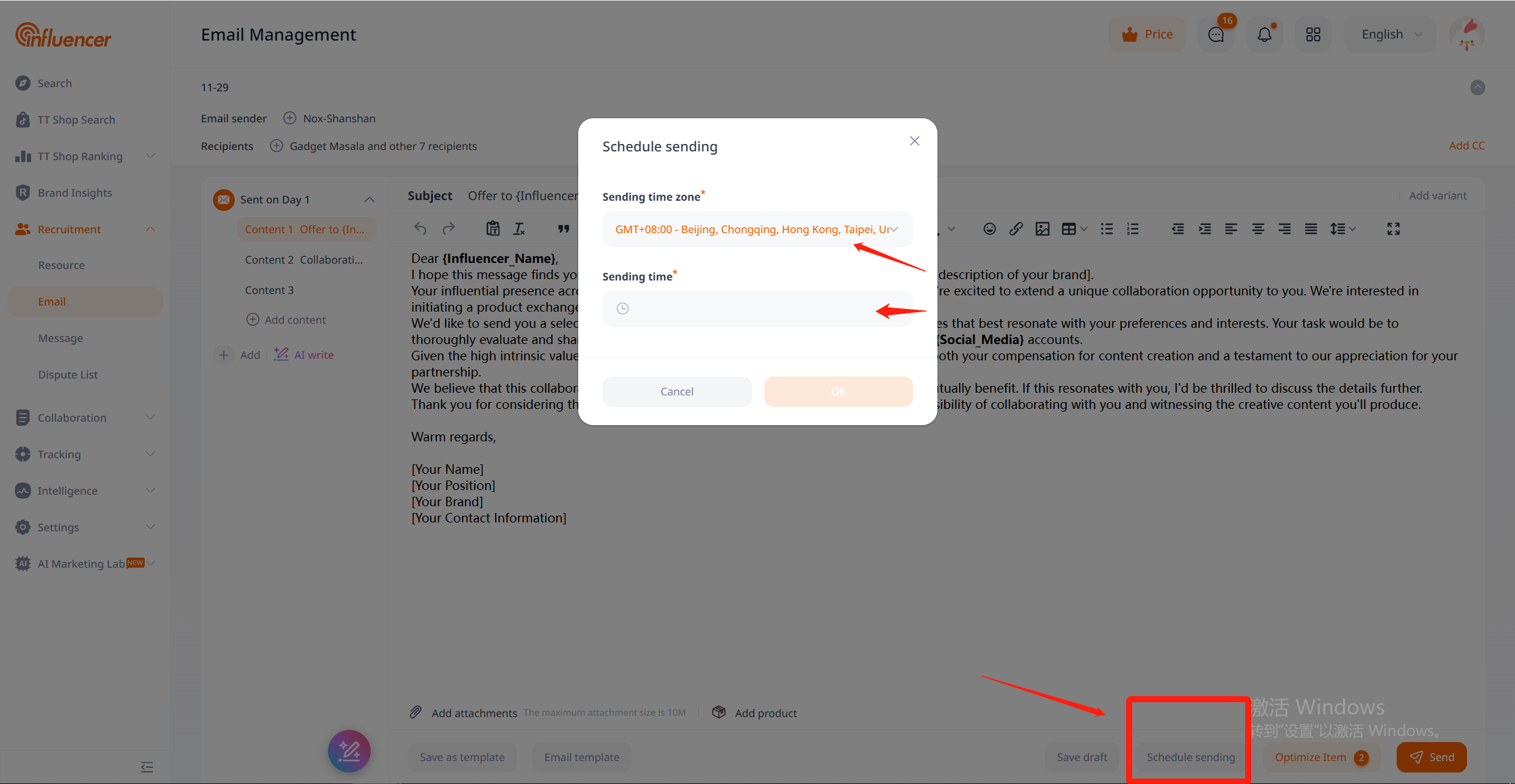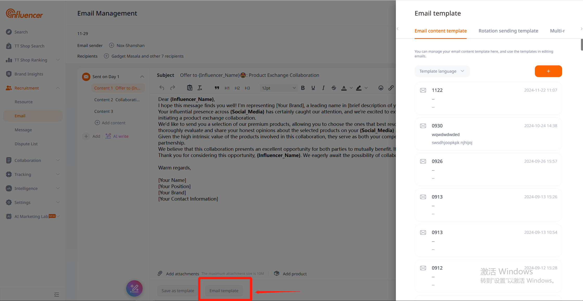 Multi-language and multi-scenario email templates are available for reaching out to influencers, and users can also save new content as templates.