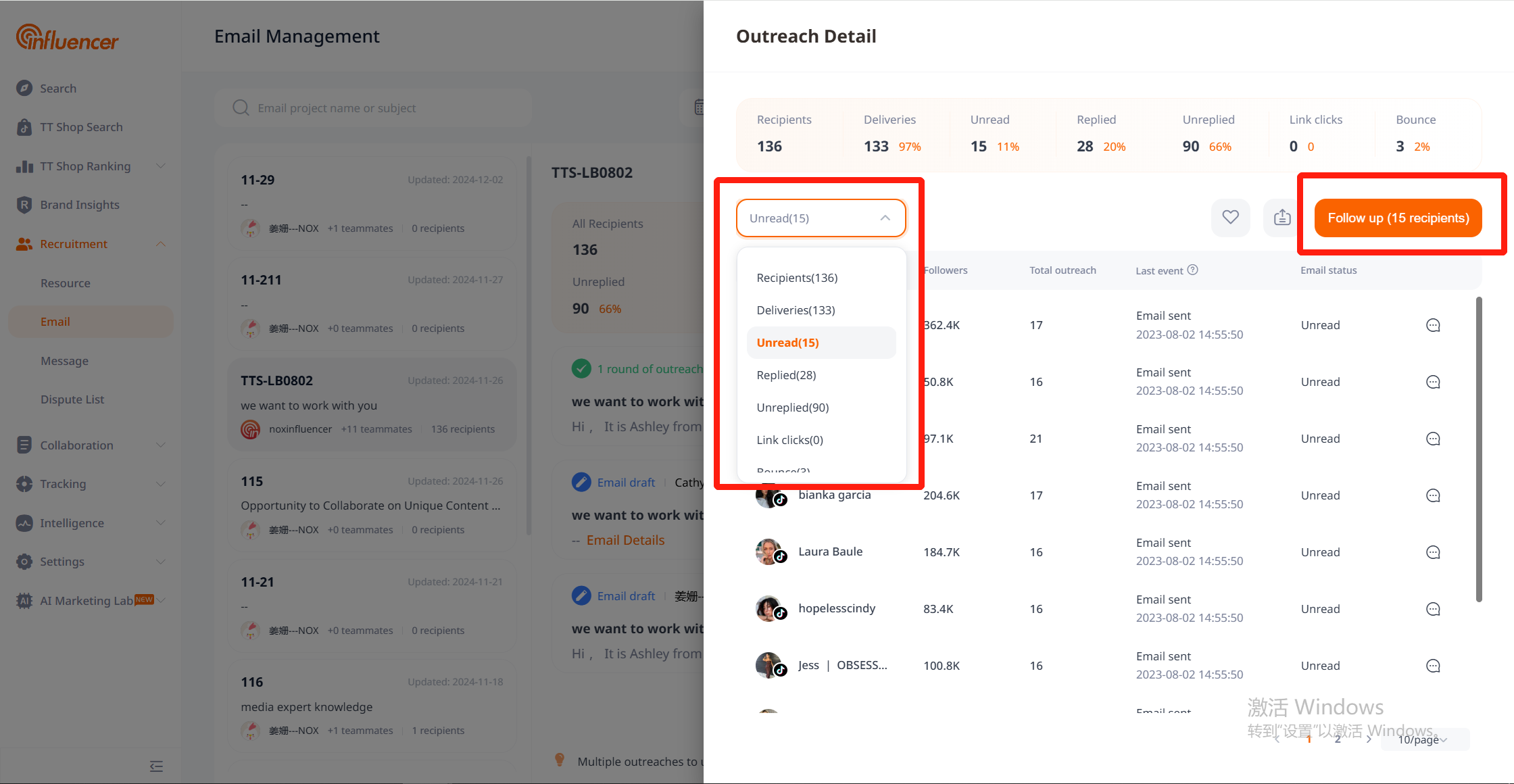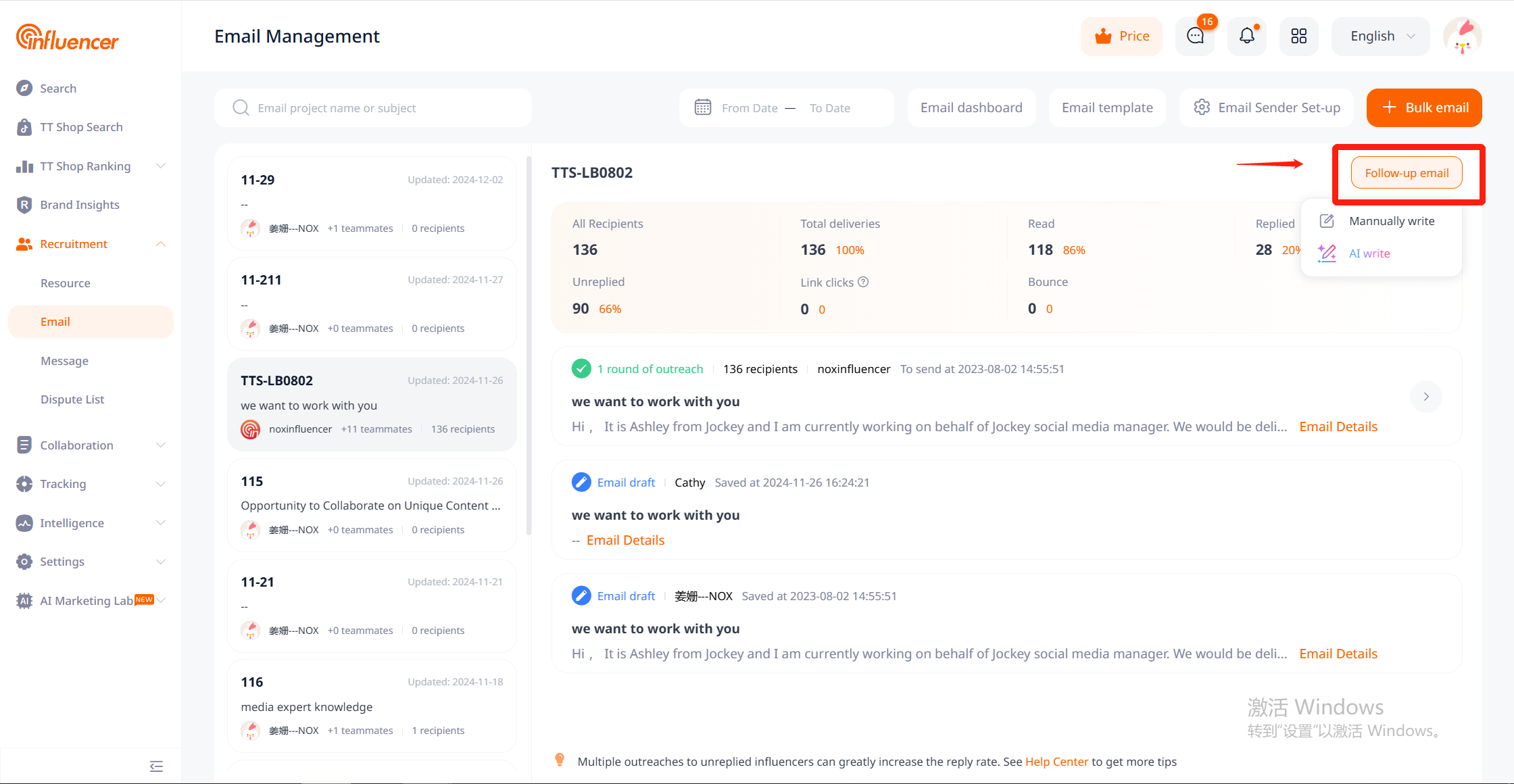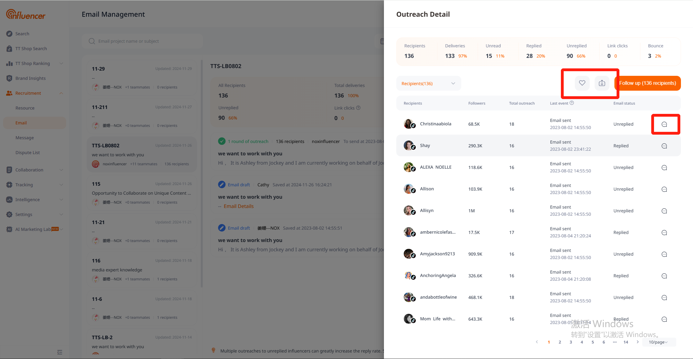 Set the sending time for each round, and the system will automatically send pre-set follow-up emails to unresponsive influencers at the designated time, with up to 5 rounds. Note: Subsequent follow-up emails will also consume the “Bulk Email Credit” .