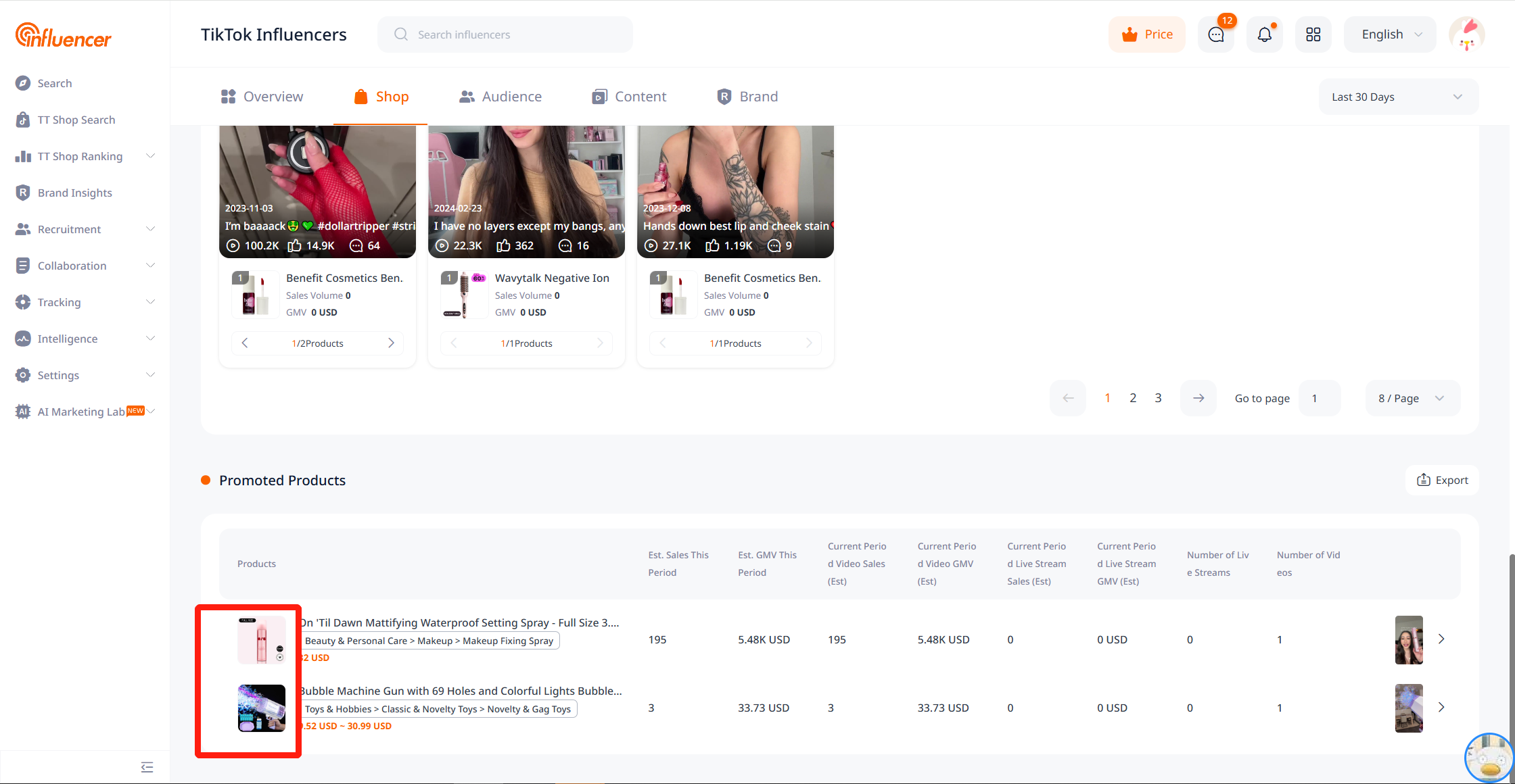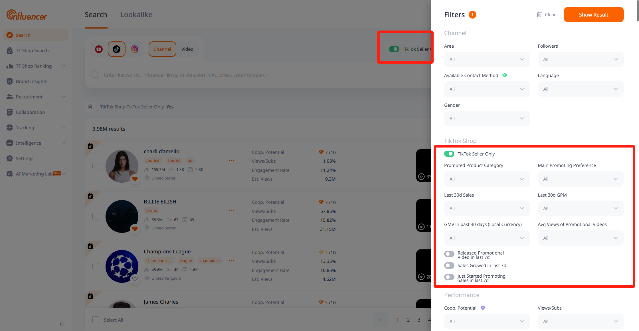 After selecting the TikTok channel search, enable ‘View Only Marketing Data’ to see all influencer marketers. Once ‘View Only Marketing Data’ is enabled, you can filter influencer marketers by product category, sales volume in the last 30 days, GPM in the last 30 days, average video views, and other dimensions.