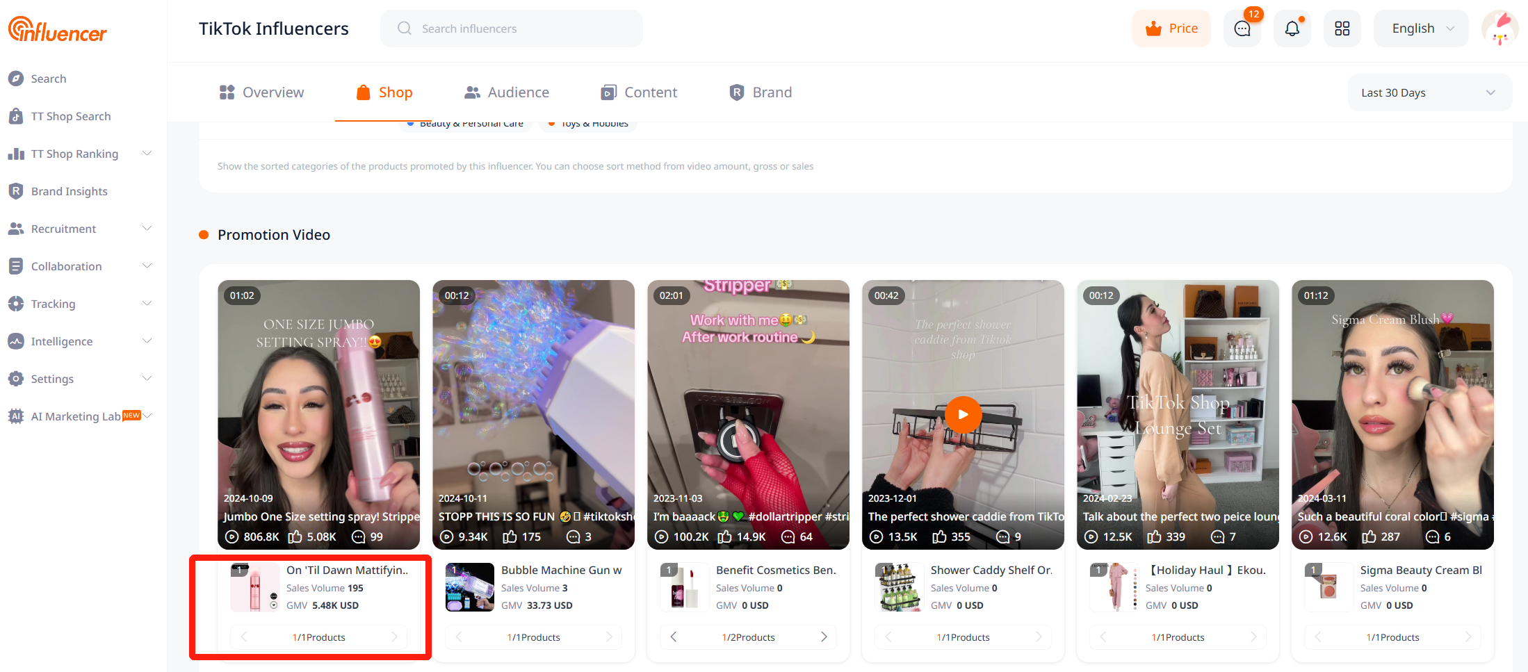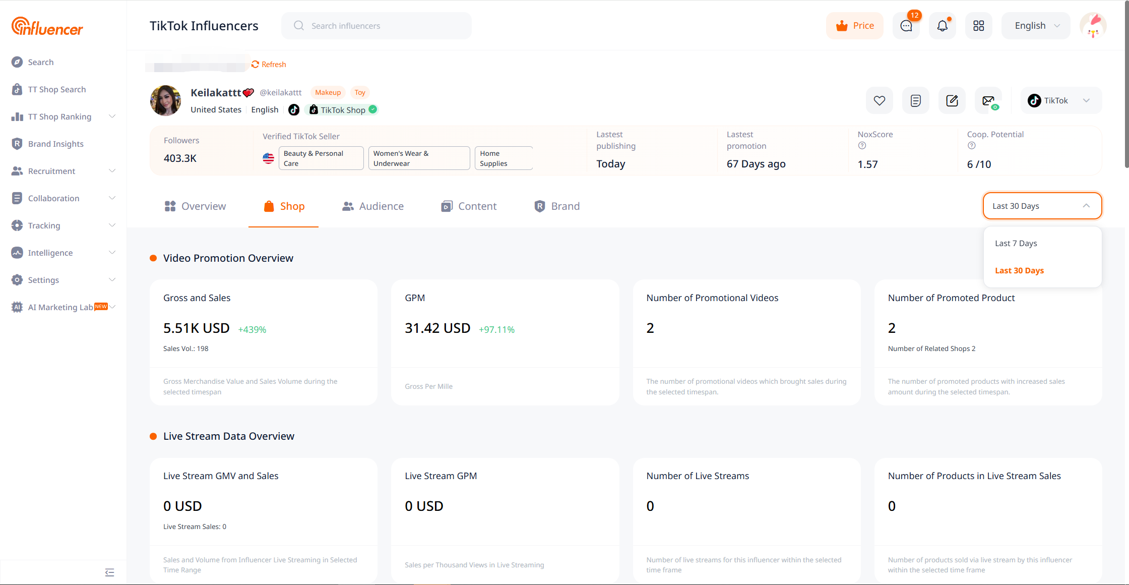By entering the influencer’s detail page and navigating to the marketing data tab, you can view the influencer’s marketing data for the past 7 days and the past 30 days. The marketing data includes an overview, marketing effectiveness, product category distribution, marketing videos, and marketed products.