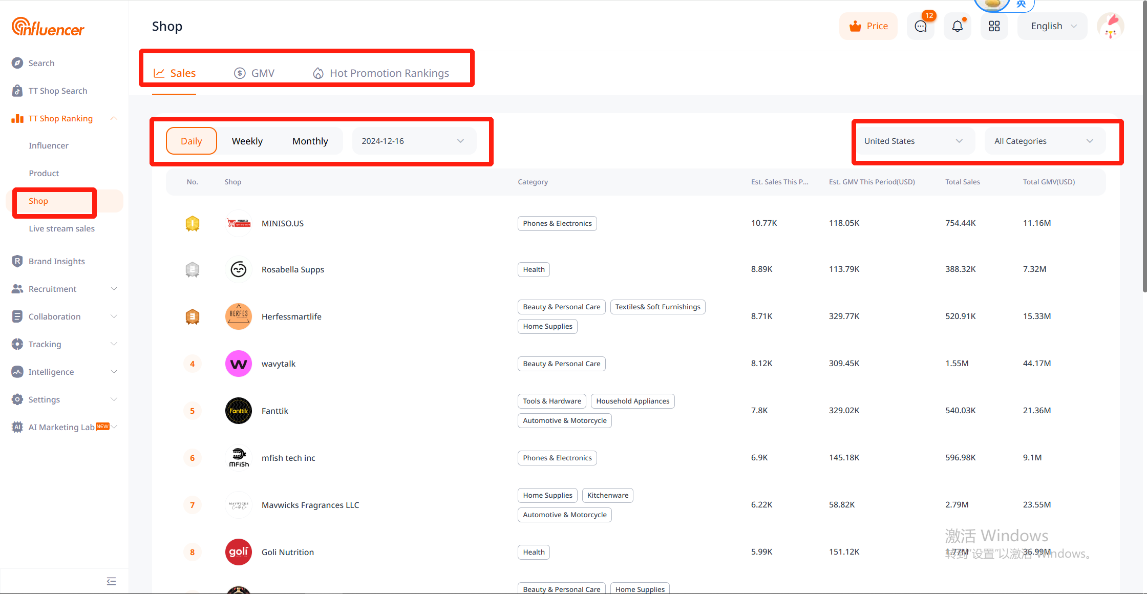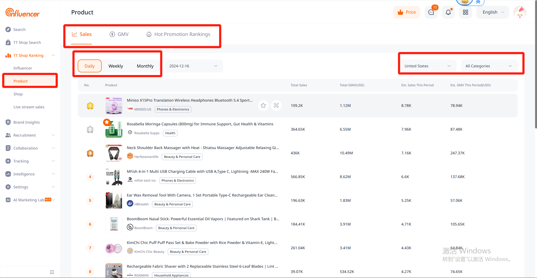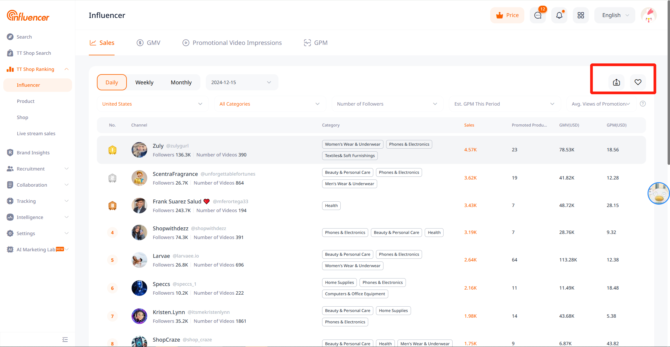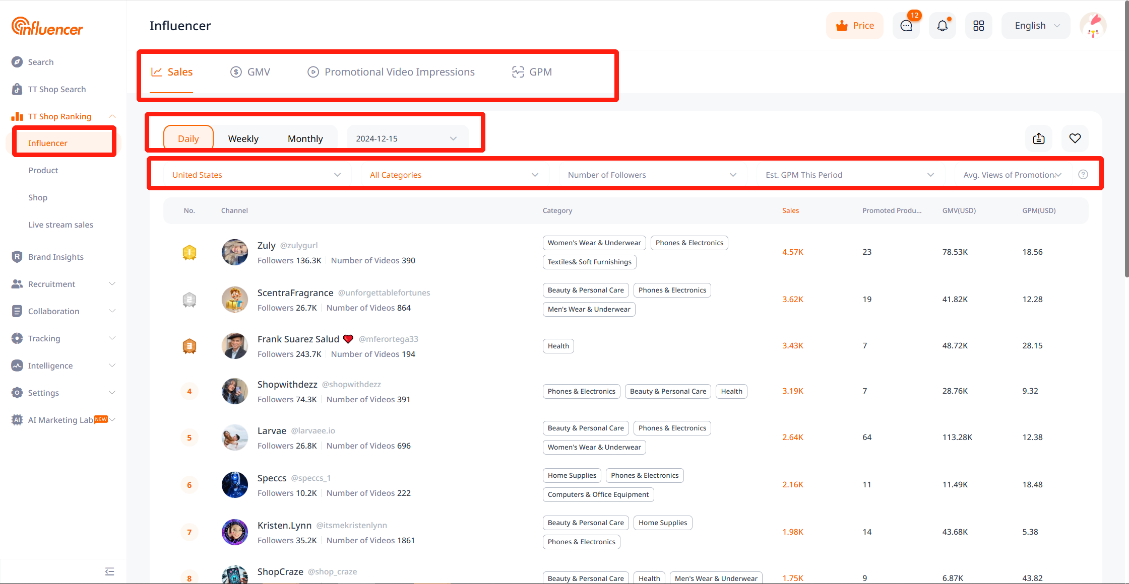 The Influencer Hot List provides different types of rankings such as sales volume, GMV, marketing video views, and GMP. Each type of ranking is presented on a daily, weekly, and monthly basis, and supports filtering by influencer region, product category, number of followers, current GMP (estimated), and average marketing video views.
