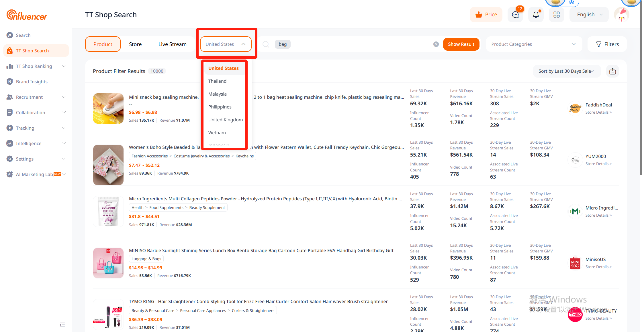Noxinfluencer provides data filtering and viewing for TikTok Shop influencers, products, and shops. It also offers multi-dimensional rankings for influencers, products, and shops to meet the TikTok data needs of overseas brands, quickly understand the latest trends, and achieve better marketing results. Currently supported regions include the United States, Thailand, Malaysia, the Philippines, and the United Kingdom. Data for other popular countries and regions will be added gradually, so please stay tuned.