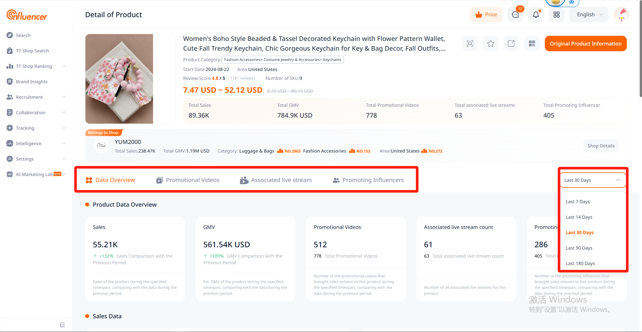 Clicking any area displaying the product name or product image will atke you to the product detail page. The product detail page displays related data from the past 7 days to the past 180 days, including product sales data, shop product information, similar product information, as well as associated video data and linked influencer data.