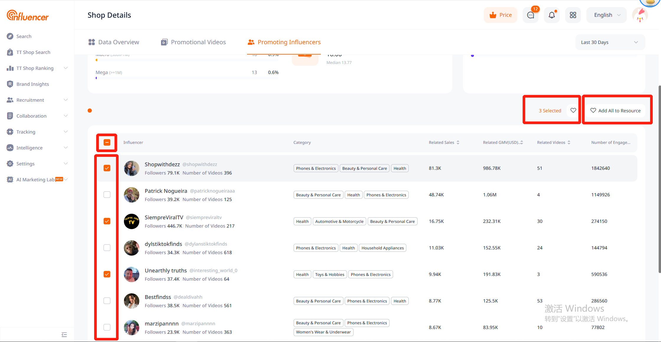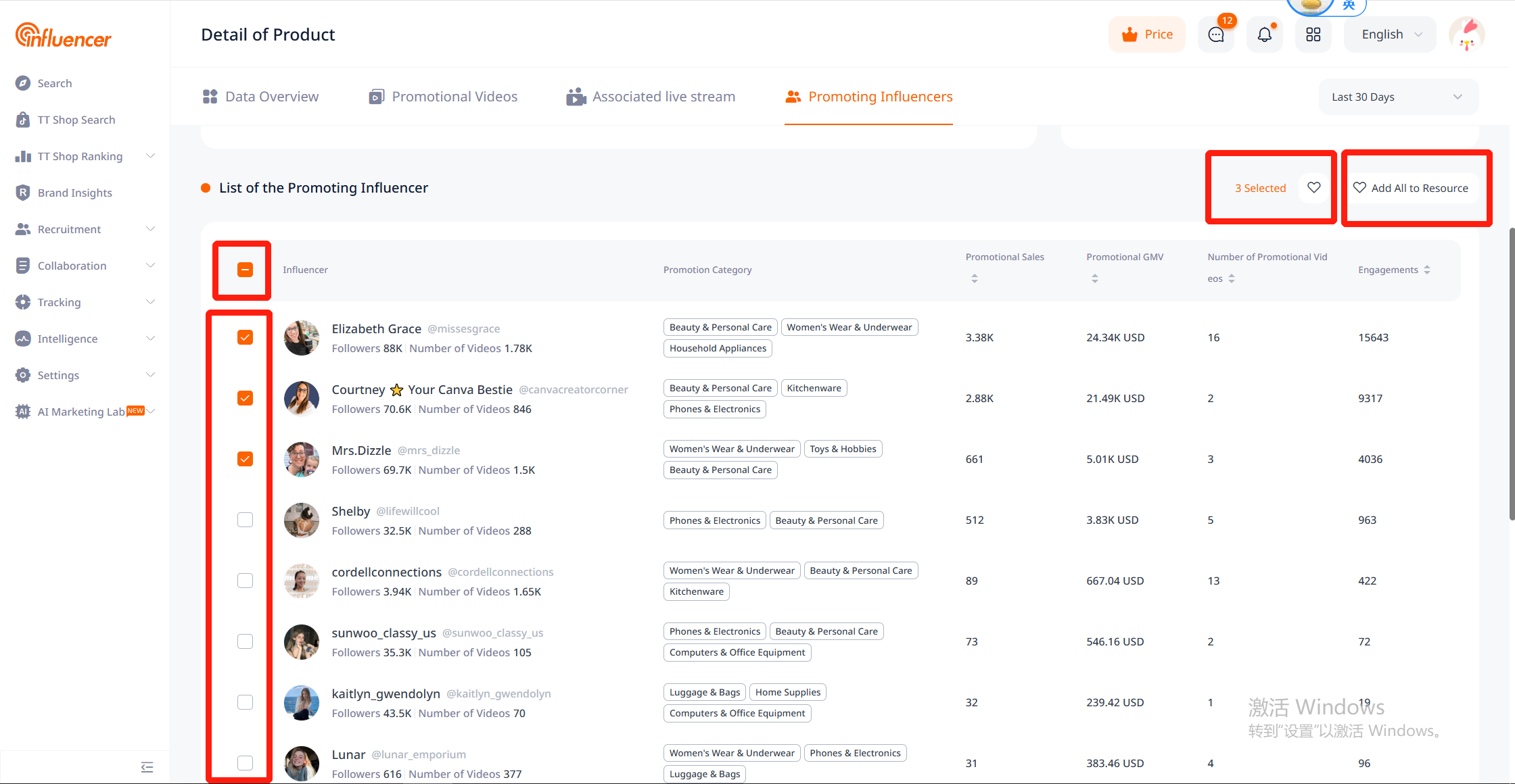 In the associated videos and linked influencers atb, clicking on channel information (influencer name or avatar) will quickly atke you to the influencer’s selling data detail page to view data. The linked influencers list also supports one-click favoriting of linked influencers, allowing users to quickly collaborate with influencer sellers.