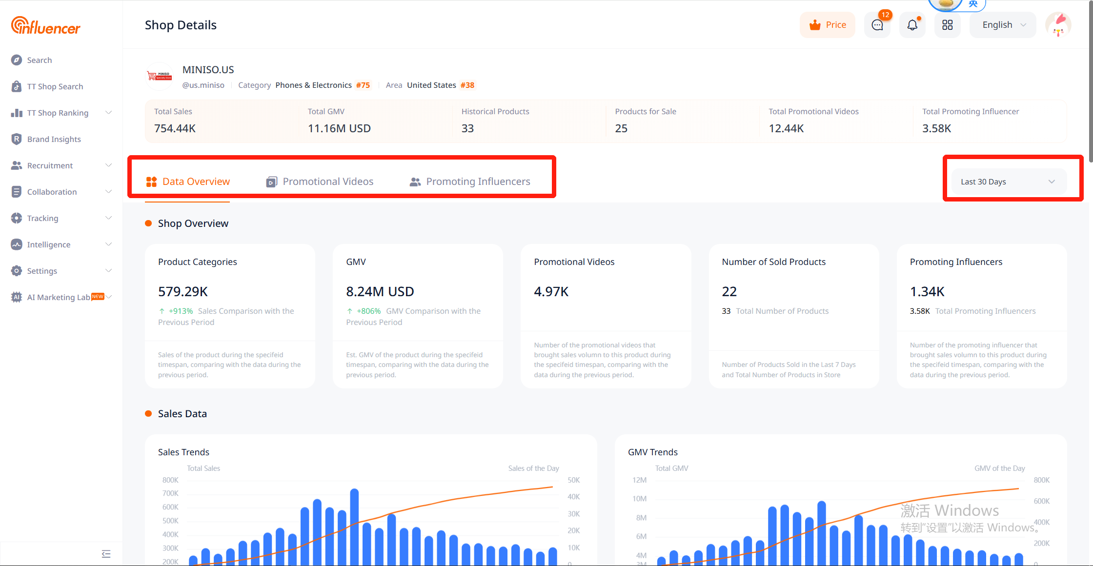 Clicking any area displaying the shop name or shop image will take you to the store detail page. The shop detail page displays related data from the past 7 days to the past 180 days, including shop sales data, product data, similar shop information, as well as associated video data and linked influencer data.